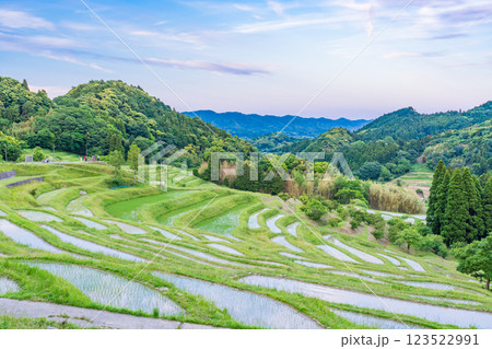 晩春の田植えが終わったばかりの大山千枚田付近の黄昏の水田
