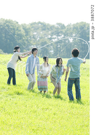 草原で縄跳びをする若者たち