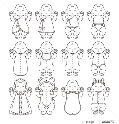 ベビー服を着た赤ちゃんのイラスト(白黒)