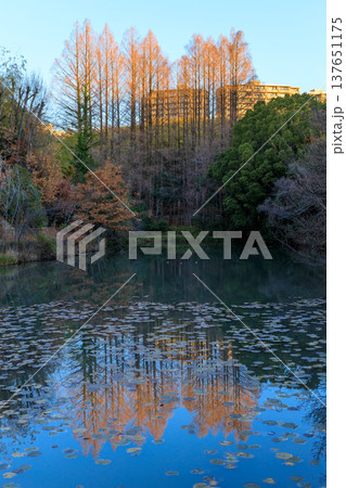 睡蓮が浮かぶ都会のオアシスに朝日に照らされたメタセコイヤが姿を映す