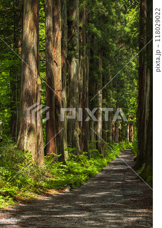 日本 長野県長野市にある戸隠神社の奥社の杉並木の参道と奥社院坊跡