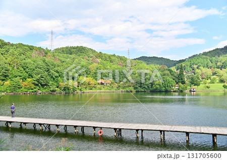 釣り桟橋越しに見る聖湖と対岸の緑地公園
