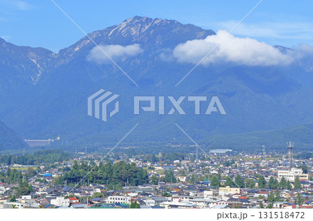 冬の朝焼けと霧に包まれた長野県上田市の住宅街と山並み