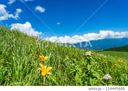 長野県茅野市 夏の車山高原の黄色いニッコウキスゲの花と山並み