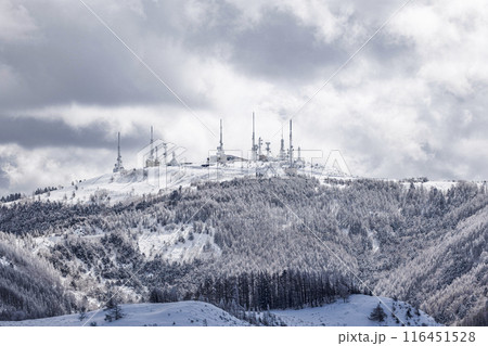 冬の八ヶ岳連峰・硫黄岳山頂の祠と奥秩父の山並み