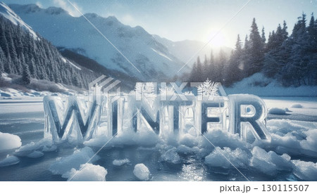 Frozen Winter Landscape with Ice Text and Snowflakes with Generative AI.