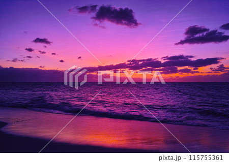 サンセットの夕日と海と波が美しい宮古島の長間浜のビーチにピンクの砂浜でバカンス(沖縄県宮古島市)