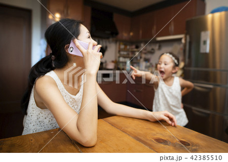 スマートフォンを持つ母と怒る娘