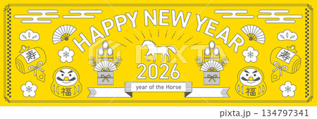 2026年の午年をイメージした横長の線画の年賀状_黄色