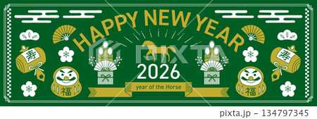 そのまま使える販売促進用バナーデザイン2026年午年、市松模様の和柄、和風の新春セール 門松