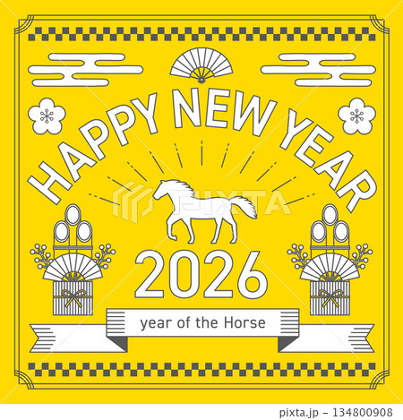 2026年の午年をイメージした正方形の線画の年賀状_黄色