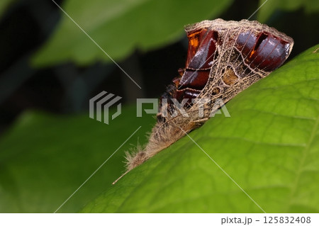 生き物 昆虫 オナガミズアオ、若齢幼虫です。小さいうちは赤茶色に黒の斑点模様です
