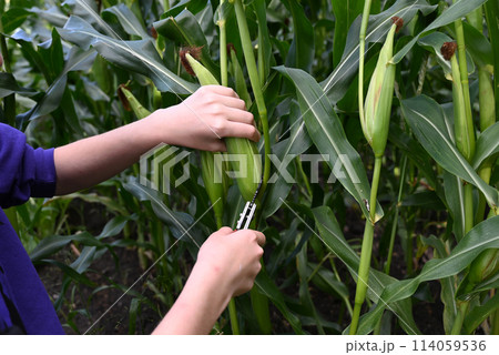 Close-up of corn plants in a rural field. Small corn plants