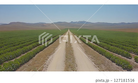 Straight dirt road through green crops leading to distant mounta