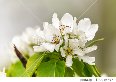 White blossoming apple trees with rain drops