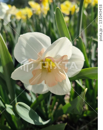 Beautiful blooming narcissus flower on sunny spring day. Varietal flower of narcissus variety Apricot Whirl. Pink petals on white petals in inflorescence with stamens on green stem leaves in ground