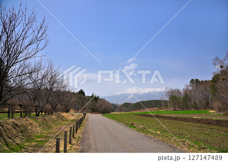 早春の快晴の青空をバックに残雪の御嶽山を望む