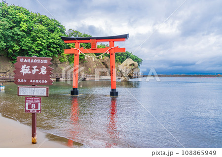 (北海道)江差町鷗島(かもめじま)の厳島神社鳥居と瓶子岩