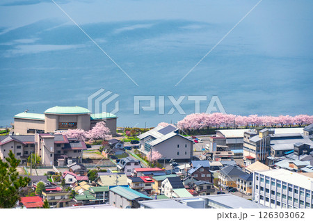 諏訪湖間欠泉センターと桜並木【諏訪市湖岸通り】