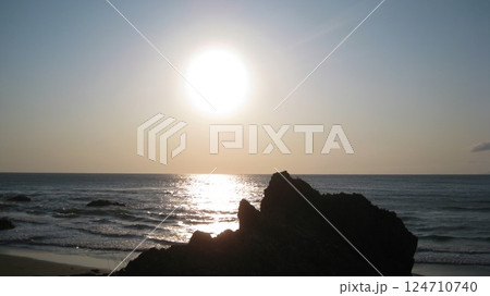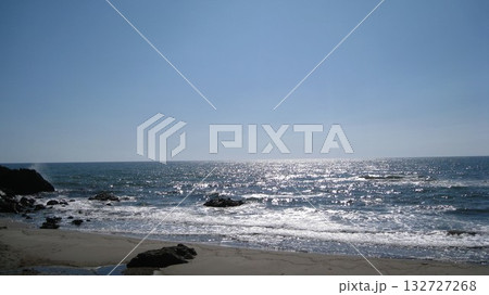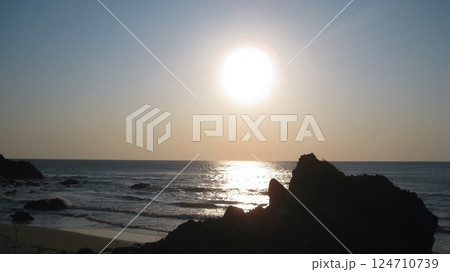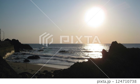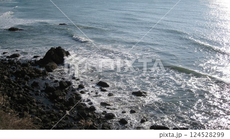 春の日本海の打ち寄せる白波と砂浜と奇岩