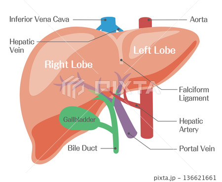 肝臓の構造図(右葉・左葉・門脈・肝動脈)