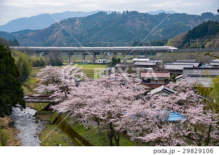 満開の桜と関ヶ原集落を走る新幹線