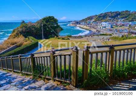 快晴の神奈川県鎌倉市の稲村ヶ崎から富士山、江の島方面を眺める
