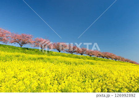 栃木県小山市 思川沿いの間々田地区と乙女地区にまたがる思川桜堤 原産種の思川桜並木と斜面の菜の花畑