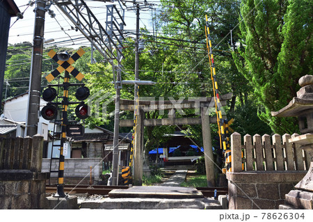 参道に踏切その向こうに鳥居