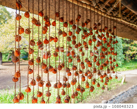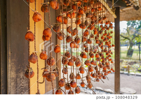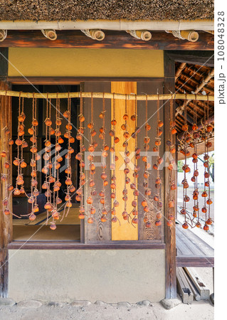 農家の軒下に吊るされた秋の干し柿