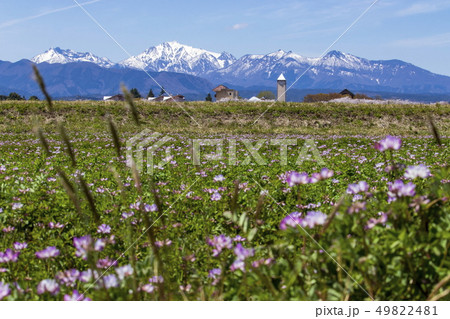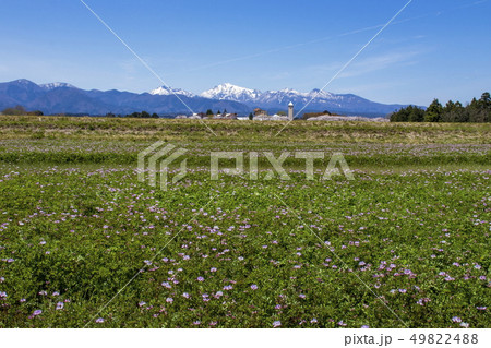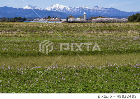 レンゲ畑と農大と残雪の中国山地_鳥取県倉吉市関金町にて