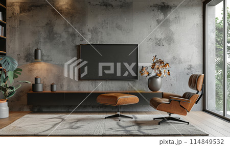 Cabinet for TV and accessories decor in living room interior on empty dark wall background