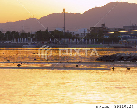 夕暮れ染まりゆく香櫨園浜(御前浜公園)と野鳥たち
