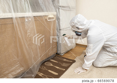 流し台と冷蔵庫の間に殺虫剤を散布する害虫駆除の作業員