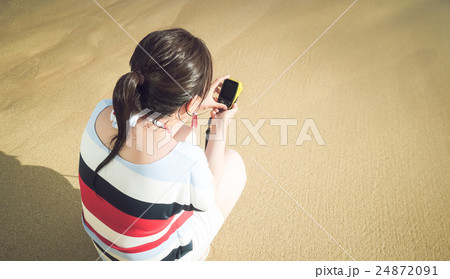 アウトドア用のデジカメを構える小学生女の子 トレッキングイメージ