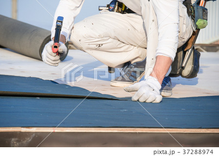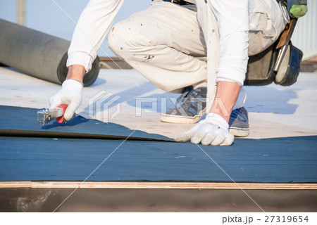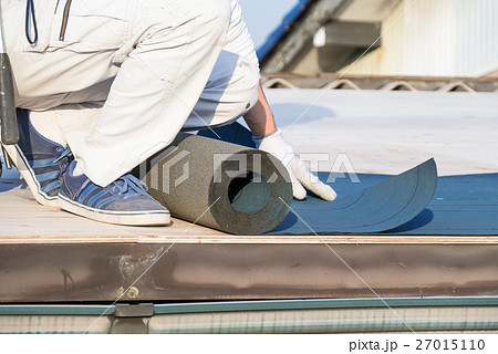 屋根工事 防水シートを貼る職人