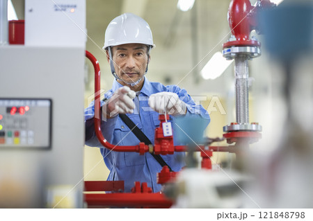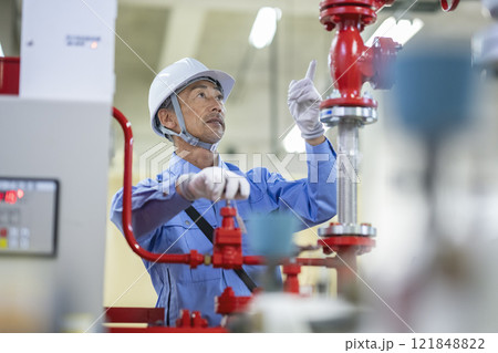 スプリンクラー設備の点検をするベテランの作業員 ビルメンテナンススタッフ イメージ