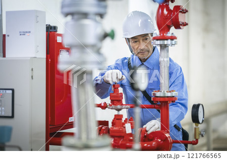 ビルのスプリンクラー設備の点検をするベテランの作業員 ビルメンテナンススタッフ イメージ