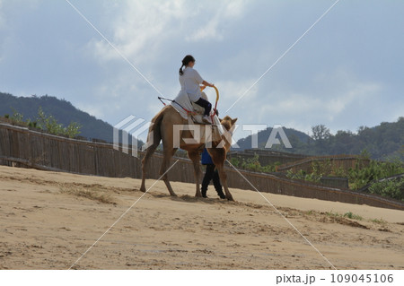 鳥取砂丘でラクダライドを楽しむ観光客