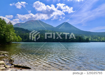 阿寒湖湖畔より阿寒岳を望む