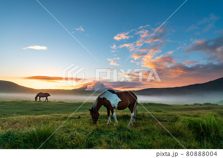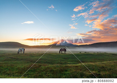 早朝の夏の阿蘇に浮かぶ雲海に放牧された馬や牛が居る夜明けの風景
