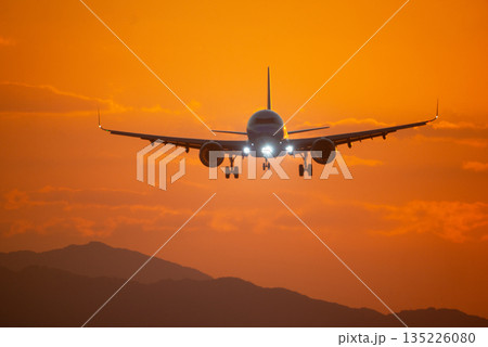 着陸する旅客機と夕陽