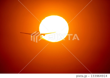 美しい夕陽が燃え上がる様な背景に飛行機風景