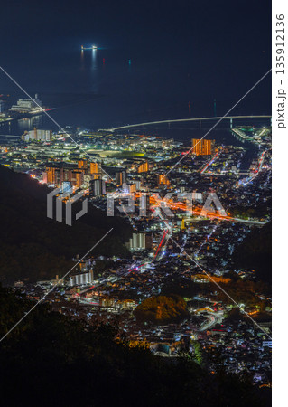日本 広島県呉市栃原町にある灰ヶ峰の展望台から望む阿賀マリノ大橋の夜景と瀬戸内海