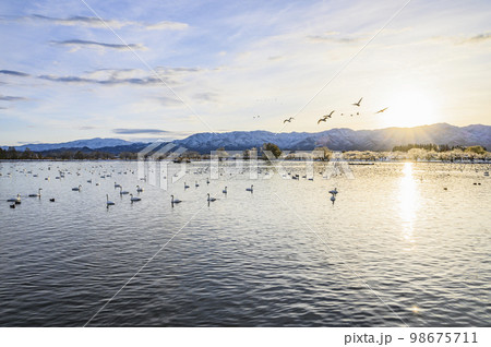 冬の瓢湖と白鳥(新潟県阿賀野市)