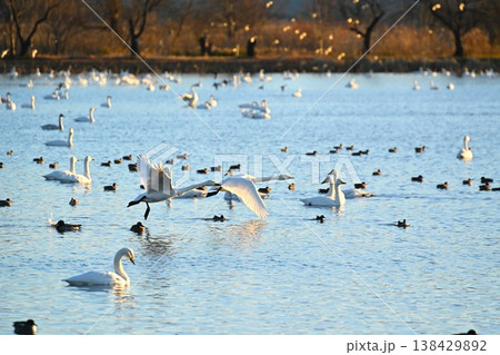 瓢湖の水面を飛ぶ白鳥の群れ(新潟県阿賀野市)