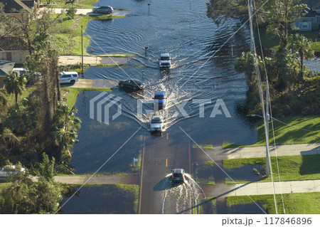 Flooded Florida road with evacuating cars and surrounded with water houses in suburban residential area. Consequences of hurricane natural disaster