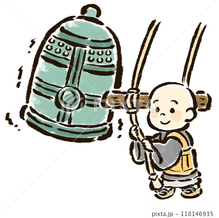 除夜の鐘を鳴らす子供のお坊さんの手描きイラスト 背景あり