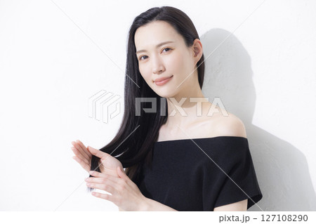 黒いオフショルを着た女性