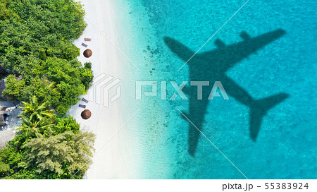 Travel concept with airplane shadow and beach